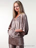 Домашний костюм из велюра. Объемная в верхней части туника в нижней части имеет широкий, обтягивающий бедра, пояс из велюрового полотна в резинку. Модель с карманами «кенгуру», объемным капюшоном и застежкой на тесьму-молнию. Правый рукав декорирован крупным принтом. Брюки со штрипками.