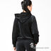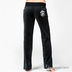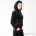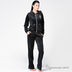 Мягкий домашний костюм из черного велюра декорирован оригинальными деталями. Отделка карманов и рукавов, логотип -нашивка на куртке и брюках выполнены из нити серебристого цвета. Капюшон украшен велюровым шнурком черного цвета с наконечником-колокольчиком.