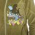 Велюровый костюм. Сложные рельефы рукавов. Округлая форма карманов с трикотажной отделкой. Цветной принт на груди и спине. Пояса куртки и брюк, манжеты рукавов из трикотажа. Брюки прямые, с фигурной кокеткой сзади.