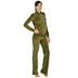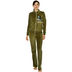 Велюровый костюм. Сложные рельефы рукавов. Округлая форма карманов с трикотажной отделкой. Цветной принт на груди и спине. Пояса куртки и брюк, манжеты рукавов из трикотажа. Брюки прямые, с фигурной кокеткой сзади.