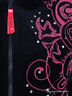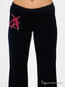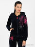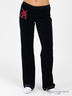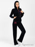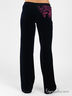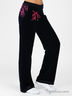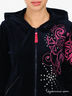 Отличный домашний костюм из эластичного велюра. Олимпийка на молнии с капюшоном и двумя втачными карманами. Декорирована оригинальным принтом и стразами. Брюки расклешенного силуэта с отрезным поясом на резинке, декорированы шнуровкой. Манжеты длинного рукава, низ олимпийки и пояс брюк выполнены из трикотажа рибаны. Великолепный вариант как для дома, так и для прогулок.