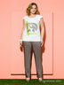 Костюм трехпредметный: туника, топ, брюки. Туника полуприлегающего силуэта, длиной до линии бедер. Брюки плотнооблегающие вверху и расширенные к низу с притачным поясом. Джемпер полуприлегающего силуэта, длиной до линии бедер, с круглым вырезом горловины. декорирована принтом.