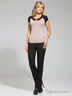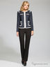 Костюм женский 3-х предметный: жакет, джемпер, брюки. Жакет полуприлегающего силуэта, без воротника с длинными рукавами. Центральная застежка на молнию. Декорирован белыми кожаными вставками. Брюки прямые. Джемпер с короткими рукавами и округлым вырезом горловины.