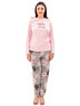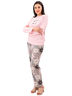 Костюм домашний женский. Однотонная толстовка с длинными рукавами и круглым вырезом. Передняя деталь украшена вышивкой. Брюки длинные прямые из набивного флиса, пояс на комфортной резинке.