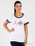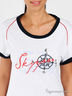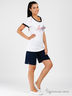 Трикотажная футболка прямого силуэта с округлым вырезом горловины и коротким рукавом. Полочка декорирована аппликациями.