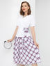 Поговорим? На языке моды. Когда слова и жесты не нужны, а образ говорит сам за себя. Идеально: костюм для вас из белоснежного жакета на запахе и юбки с красочной клеткой. Детали: люверсы, пояс-бант, эффектный вырез.