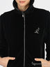 Стильный велюровый спортивный костюм из олимпийки и брюк. Олимпийка с воротником стойкой на молнии украшенной стразами. Подклад воротника выполнен из атласа в тон. Длинные рукава с манжетами-резинкой. Два прорезных кармана. По низу изделия - кулиска. Брюки прямого покроя. Посажены на резинку. Костюм декорирован стразами.