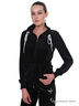 Женский спортивный костюм черного цвета. Куртка украшена фирменной эмблемой, с карманами-кенгуру спереди и высоким воротом. Низ куртки и манжеты рукавов присобраны с помощью эластичной отстрочки.