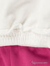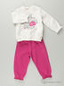 Спортивный костюм состоит из толстовки и брюк. Толстовка с округлым вырезом горловины выполнена из плотного трикотажа с футеровым подкладом и застегивается на три кнопки на спинке. Манжеты и низ изделия с многорядными резинками. Вырез горловины декорирован рюшами. Полочка украшена принтами. Брюки прямого силуэта выполнены из плотного трикотажа с футеровым подкладом. В трикотажный пояс вшита резинка. Низ брючин посажен на многорядную резинку.