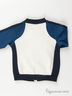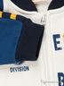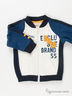 Толстовка с воротом стойкой и длинным рукавом выполнена из плотного трикотажа с футеровым подкладом и застегивается на молнию. Имитация кармана "кенгуру". Ворот, манжеты и низ изделия - трикотажные резинки. Полочка украшена принтами и нашивкой. Контрастные вставки.