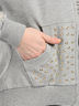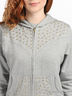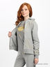 Толстовка с капюшоном, на молнии, с карманами-кенгуру. Украшенна термоаппликациями в виде металлических кружков. На груди лонгслива золотистый принт и аппликация в виде бабочки. Прямые брюки на резинке.