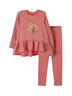 Костюм состоит из туники и леггинсов, изготовлен из хлопкового футболочного трикотажа средней плотности, с эластаном.Туника с длинным рукавом на манжете. По низу волан, перед укорочен, в горловине манжет. Спереди стильный принт. В поясе леггинсов эластичная тесьма. Идеальная одежда для девочки в детский садик и для прогулок на улице летом. Цвет костюма с оттенком розового.