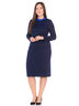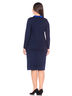 Костюм трикотажный выполнен плотной вязкой. Состоит из прямой юбки и жакета с длинным рукавом. Полочка украшена принтом в виде Незабудки. Горловина оформлена воротником-стойкой с разрезом сзади.