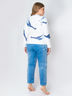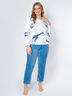 Уютный костюм из велсофта, состоящий из джемпера и брюк. Джемпер с оригинальным принтом "жирафы", прямого силуэта с длинными рукавами. Брюки однотонные, контрастного цвета. Изделие прямого фасона, комфортной посадки, пояс на широкой резинке.