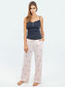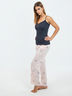 Изящный комплект для сна и отдыха. Маечка прилегающего силуэта на тонких регулируемых бретелях выполнена из вязаного трикотажного полотна "рибана". Лиф декорирован мягким кружевом и декоративной планкой с пуговицами. Брюки из принтованного хлопкового полотна. Модель свободного фасона с карманами, пояс с резинкой и декоративным шнурком.