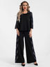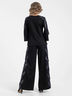Обворожительный костюм из трикотажного полотна черного цвета состоит из блузы и брюк.
