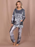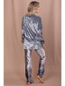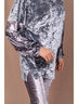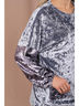 Стильный костюм, состоящий из свитшота и брюк, выполнен из бархатного трикотажного полотна серого цвета. Свитшот: круглый вырез горловины обработан внутренней обтачкой. Втачные рукава со спущенной линией проймы обработаны манжетами. По переду изделия накладные краманы. Брюки свободного силуэта, по низу брюк — манжеты. Верхняя часть брюк обработана поясом на резинке. Аксессуары в комплект не входят.