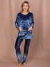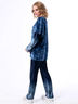 Стильный костюм, состоящий из свитшота и брюк, выполнен из бархатного трикотажного полотна синего цвета. Свитшот: круглый вырез горловины обработан внутренней обтачкой. Втачные рукава со спущенной линией проймы обработаны манжетами. По переду изделия накладные краманы. Брюки свободного силуэта, по низу брюк — манжеты. Верхняя часть брюк обработана поясом на резинке. Аксессуары в комплект не входят.