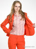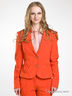 Приталенный пиджак застегивается на две пуговицы. Рельефные вытачки. Два передних кармана с декоративными сборками. По плечевому шву рукава слегка присобраны. Рукава посажены на манжеты, застегивающиеся на пуговицы.