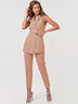 Комплект из костюмной ткани, состоящий из жилета полуприлегающего силуэта на подкладке и зауженных брюк. Детали жилета: шалевый воротник, пояс из основной ткани с пряжкой в комплекте, шлевки в боковых швах, правый борт с провисанием, застежка на потайные кнопки. Детали брюк: широкий притачной пояс со шлевками, застроченные стрелки по переду, боковые карманы, застежка на молнию и крючок