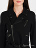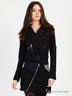Стильная косуха из плотного трикотажа. В состав ткани входит шелковая нить, делающая ткань мягкой. Яркий подклад рукавов. На полочке и рукавах карманы на серебряных молниях. На воротнике клепки, позволяющие пристегивать лацканы. По нижней части изделия пришиты шлевки, поясок в комплекте.