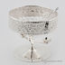 Креманка с ложечкой в обрамлении металла с серебряно-никелевым покрытием богато декорирована цветочным узором и тонко выполненными деталями в виде стилизованных растений.
