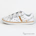 Стильные и удобные кроссовки белого цвета из натуральной замши для активного отдыха. Перфорация по всей поверхности обуви позволяет обеспечить свободный поток воздуха .Модель на трех липучках. Язычок и воротник обуви сделаны с поролоновой прокладкой для еще большего комфорта. Съемная стелька. Боковые стороны дополнены вставкой золотого цвета. Подошва на толстой резине с прошивкой.