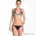 Стильный купальник-бикини с жесткими чашечками (push-up) с лентами-завязками на плавках и лифе. Плавки однотонные c двойной подкладкой для поддержания пресса, декорированные логотипом производителя из страз. Чашечки-треугольники с расцветкой "пятна леопарда" на лентах-завязках, расшитые черными и перламутровыми пайетками.