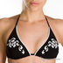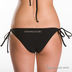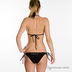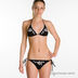 Стильный купальник-бикини со съемными чашечками с лентами-завязками на плавках и лифе. Плавки однотонные на завязках, декорированные логотипом производителя из страз, контрастным принтом с разноцветными стразами и тонкой тесьмой контрастного цвета. Чашечки-треугольники с контрастным принтом на лентах-завязках, декорированные разноцветными стразами.