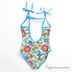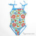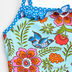 Голубой купальник для девочки. Классическая слитная модель на перекрещивающихся на спинке бретельках. Изделие украшно контрастной оборкой и принтами в виде цветов и птиц.