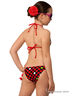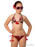 Яркий купальник-бикини выполнен из приятной на ощупь лайкры с модным принтом. Топ выполнен в виде двух треугольников, соединенных на спине и на шее узкими завязками. Плавки-бикини с завязками на боках. Топ спереди и плавки на боках декорированы маленькими помпончиками.