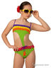 Красочный купальник-трикини из гладкого материала. Тонкие бретели. Верхняя и нижняя часть купальника соединяются с помощью сужающийся к низу части. Купальник декорирован многослойной разноцветной бахромой.