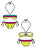 Изящный раздельный купальник из приятной на ощупь ткани с оригинальным принтом. Топ с бретель-петлей. Застежка на спине. Плавки-бикини со средней линией талии. Завязки на боках. Купальник декорирован красочной бахромой.