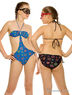Элегантный купальник-трикини из потрясающей ткани. Ворот узкая бретель-петля с завязками на шее. Верхняя часть завязывается на спине. Узкая, расширяющаяся к низу полоса соединяет верх и низ купальника. На боках нижней части декоративные бантики.
