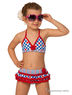 Великолепный раздельный купальник выполнен из яркой, приятной на ощупь лайкры. Топ в виде соединенных на спине треугольников с завязками на шее. Спереди соединение треугольников декорировано цветком и оборками по низу топа. Плавки декорированы миниатюрной пышной юбкой с оборками и цветком на боку.