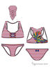 Замечательный купальник из качественного материала с ярким принтом. Топ с округлым вырезом горловины. Полочка дополнена декоративной шнуровкой. На спинке выполнен красочный рисунок. Плавки-слипы. Узкие бочки. На задней части расположен изящный бантик.