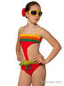 Красочный купальник-трикини из гладкого материала. Тонкие бретели. Верхняя и нижняя часть купальника соединяются с помощью сужающийся к низу части. Купальник декорирован многослойной разноцветной бахромой.
