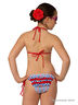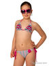 Стильный раздельный купальник-бикини выполнен из качественного материала. Топ состоит из двух широких треугольников соединенных на шее и на спине завязками. Декорирован оборками. Плавки-бикини с завязками на боках спереди декорированы оригинальным цветком.