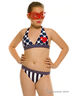 Оригинальный раздельный купальник из плотного материала с оригинальным принтом. Топ с широкой бретель-петлей, завязанной на шее. Низ топа из широкой полосы с застежкой на спине. Плавки-слипы со средней посадкой на талии. Узкие бочки.