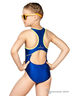 Спортивный купальник-трикини для девочек. Верхняя часть – с выходом на узкую деталь спины спортивного типа – соединяется с комфортными плавками со средним бочком. Яркий бирюзовый цвет изделия, контрастные окантовки и стильный флуоресцентный принт "Вперёд, к звёздам" выполняют не только декоративную функцию, но и помогают оценивать отточенность движений юных звёзд спорта.