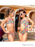 Детский раздельный купальник. Ассиметричный топ на застежке с широкой бретелью на одно плечо и контрастной завязкой на другое. Украшен декоративными элементами в виде ярких больших пуговиц. Классические плавки комфортной посадки на узком контрастном поясе. Купальник выполнен из оригинальной принтованной ткани.