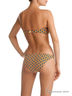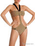 Новинка сезона! Экстравагантный молодёжный купальник-трикини. Бюст-бандо с эффектным галстуком по центру передней детали, который фиксируется на шее, и оригинальные плавки-танго сложного кроя, комфортной посадки с широкими боковыми вставкам соединяются по центру узкой фигурной деталью 'якорь'. Передняя деталь – трансформер съёмного типа с градацией по высоте для улучшения посадки на фигуре и возможности более полного загара. Актуальная графика принта и экстравагантные золотые пряжки со шнуровкой великолепно подчёркивают силуэт изделия.