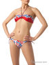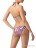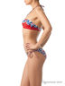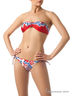 Яркий молодёжный купальник. Бюст – мягкое бандо с тонкими завязками на шее и застёжкой на спине. Плавки-бикини заниженной посадки с тонкими завязками по бокам для удобной регулировки объёма. Модель выполнена из эффектной блестящей лайкры в ярком рисунке цветочной абстракции с насыщенной цветовой гаммой классического триколора.