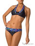Стильный купальник из двух предметов. Бюст - топ с глубокими анатомическими треугольниками на широких галстучных завязках и застёжкой на спине. Бюст украшен шёлковым бантом со стеклянной цветной подвеской. Плавки комфортной посадки с мягким драпированным отворотом по талии. Рельефные линии купальника из принтованной ткани выделены серебряными кантами.