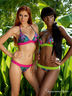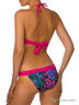 Молодёжный купальник из двух предметов. Бюст - мягкие треугольники со съёмными чашечками, с тонким завязками на шею и широким поясом под грудью. Плавки - танго низкой посадке с широким контрастным поясом. Купальник выполнен из матовой лайкры, в острой комбинированной манере, в сочетании яркого динамичного принта, однотонной контрастной ткани и цветного лайнинга.