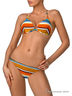 Эффектный раздельный купальник. Бюст - дублированные треугольники с рельефными линиями протектеров для лёгкого пуш-ап, на тонких завязках с фиксацией на спине и шее. Плавки - низкой посадки с ультра узким бочком. Яркий динамичный принт в горизонтальную полоску разной ширины и насыщенности цветом и блестящая ткань от Corvico Lusidy Shiny отлично сочетаются в данной коллекции купальников. Модель представлена в двух цветовых сочетаниях.