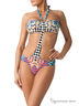 Новинка сезона! Экстравагантный молодёжный купальник-трикини. Бюст – бандо с эффектным галстуком по центру передней детали, который фиксируется на шее, и оригинальные плавки-танго сложного кроя, комфортной посадки с широкими боковыми вставкам соединяются по центру узкой фигурной деталью 'якорь'. Передняя деталь – трансформер съёмного типа с градацией по высоте для улучшения посадки на фигуре и предоставления возможности более полного загара. Сложная архитектура принта великолепно подчёркивает силуэт изделия.
