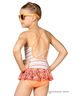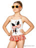 Стильный слитный купальник флуоресцентного оранжевого цвета. Оригинальная модель с юбкой-воланом, тонкими бретелями и окантовкой, переходящей в бретели, которые фиксируются на спине способом "крест-накрест". Передняя деталь купальника декорирована двумя золотистыми кольцами и стразами на детально размещённом принте "Влюблённая Модная Собачка", который прекрасно гармонирует с принтом "Стиль жизни" на юбке-волане. (Перевод надписей: "Любовь – это" и "Романтичный день".)