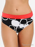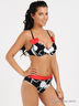 Оригинальный купальник из тонкого эластичного материала. Бюстгальтер push up на косточках с поролоновой чашкой. Застегивается сзади на металлическую застежку, бретели регулируются по длине. Трусы слипы с отворотом, пройма и пояс на резинке. Купальник декорирован оригинальным принтом и контрастными деталями.