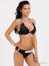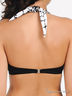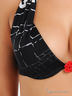 Оригинальный купальник из тонкого эластичного материала. Бюстгальтер на косточках с поролоновой чашкой, дополнен съемными вкладышами с эффектом push up. Застегивается сзади на металлическую застежку, бретели завязываются через шею, декорирован принтом. Трусы слипы, пройма и пояс на резинке, декоративный хлястик с принтом.